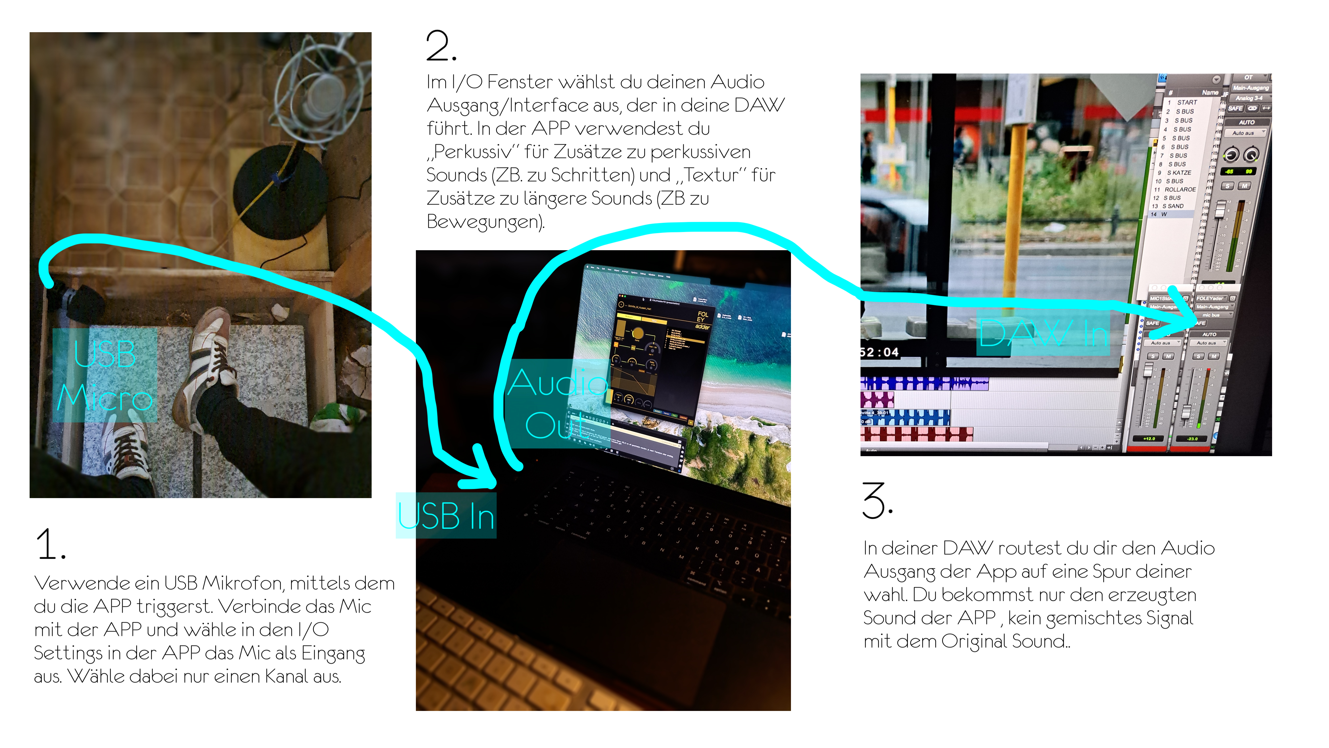 Anordnung im Studio zur Unterstützung oder Substituierung für bzw von Schrittaufnahmen. Die App wird durch ein Audiosignal getigert. Ich habe dafür ein USB-Mikrofon zum Triggern der App links neben der Fläche für die Schritte platziert. Für andere Sounds, zB. für Bewegungsgeräusche, kann man es in der Nähe des Oberkörpers mit einem Stativ platzieren oder mit einem Ministativ auf den Tisch stellen. In meinem Falle verwende ich ein USB Mikrofon der Marke TONOR TC30. In diesem Beispiel läuft die App auf einem externen Laptop. Das Audio wird dann ins die DAW eingespeist. Natürlich kann man die App auch auf der gleichen Maschine, wie die DAW laufen lassen. Hierfür dann ein internes Routing bauen: