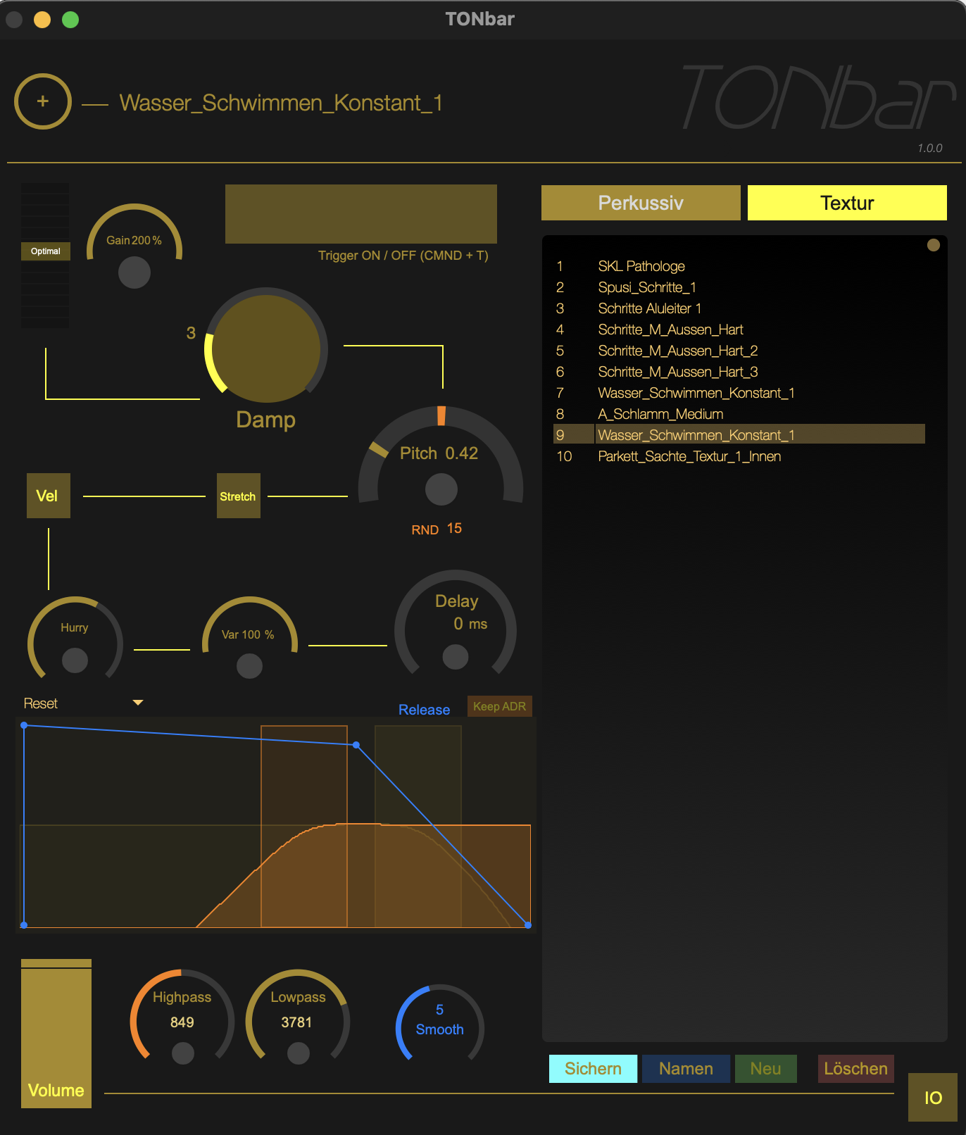 Die TONbar Application ist ein Programm zur Unterstützung bzw Klangerweiterung bei Foley Aufnahmen. Ich habe mir diese App quasi als "Addon" zu meinen Geräuschaufnahmen im Studio erstellt. Sie ergänzt meine Geräusche bei der Herstellung von schwierigen Klangereignissen. Diese sind zB. Schritte auf Glasscherben oder das komplexe Klangverhalten von Schritten auf knarzendem Parkett. Es viele Anwendungen, bei der mir diese App sehr unterstützend hilft mein en Klang zu erweitern. Je nach eingestelltem Sound hilft sie einem Originalem Sound näher zu kommen oder mehr und mehr artifiziell zu klingen.